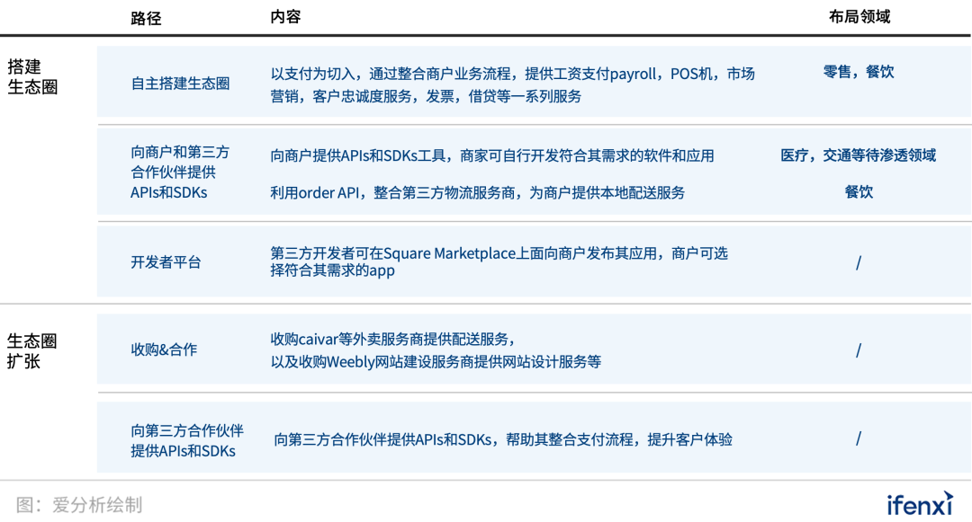 当下,支付牌照和提供单一的支付服务已经不再构成行业壁垒,第三方支付机构的竞争本质上是支付机构提供服务和软件能力的竞争。为了进一步获得更多市场,第三方支付机构需要为商户提供端到端的一系列解决方案,搭建生态服务闭环。Square从搭建生态圈,与第三方合作伙伴合作和开放支付平台三种路径赋能中小商户,拓展生态圈规模。