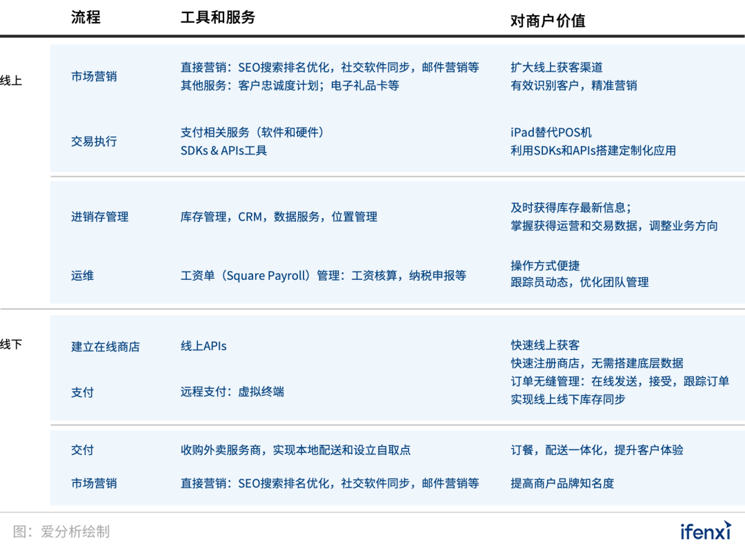 以零售领域为例,在金融服务方面,Square Capital可从工资单(Square Payroll)中提取商户交易数据,向小微商户发放贷款。商户服务方面,Square通过优化支付硬件,把支付服务和商户业务流程进行整合,渗透到商户运营中。