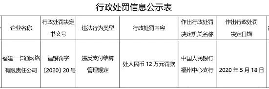 近日,中国人民银行福州中心支行发布新罚单,福建一卡通网络有限责任公司因违反支付结算管理规定被罚款人民币12万元。