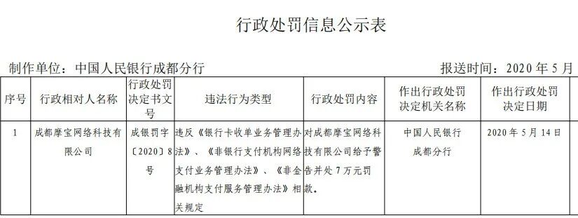 近日,中国人民银行成都分行网站近日公布的行政处罚信息公示表(成银罚字〔2020〕8号)显示,成都摩宝网络科技有限公司违反《银行卡收单业务管理办法》、《非银行支付机构网络支付业务管理办法》、《非金融机构支付服务管理办法》相关规定,中国人民银行成都分行对其给予警告并处 7 万元罚款。