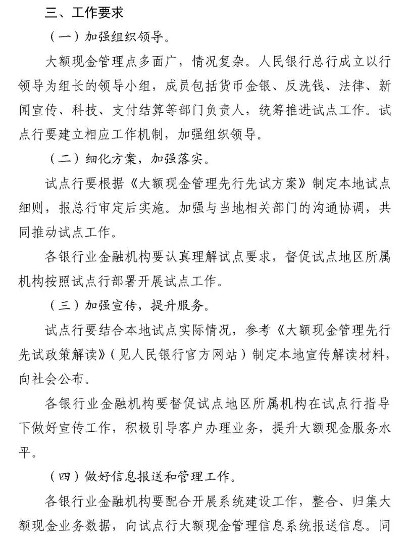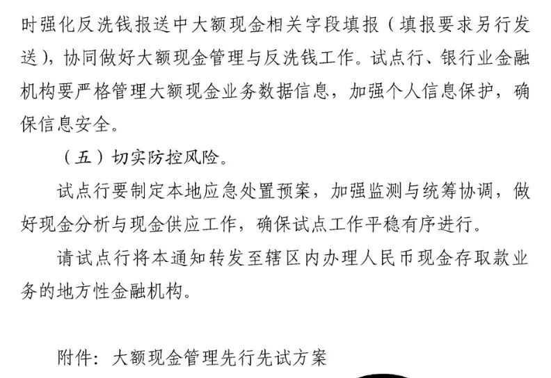 《通知》明确,管理金额起点须符合人民银行总行对起点金额以上业务笔数、金额在总业务量中比例要求,不影响个人、企业特别是个体工商户正常、合理的用现需要,对监测非常规大额用现行为有针对性,既避免银行业金融机构工作负担过重,又对客户的整体影响较小。