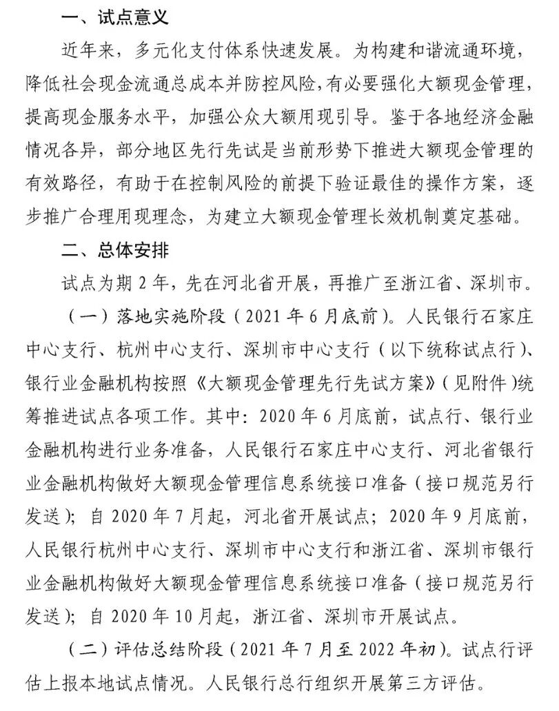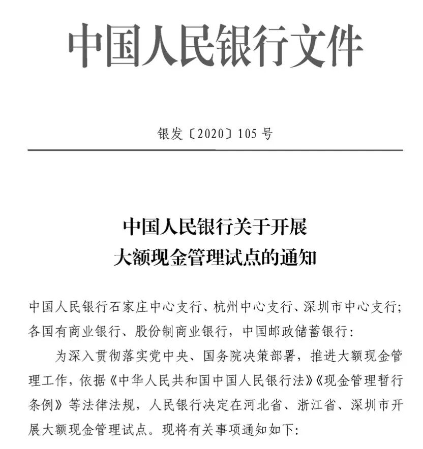 今日,央行发布关于开展大额现金管理试点的通知。试点为期2年,先在河北省开展,再推广至浙江省、深圳市。目前设定河北省、浙江省和深圳市试点对公账户管理起点为50万元,对私账户管理起点分别为10万元、30万元、20万元。