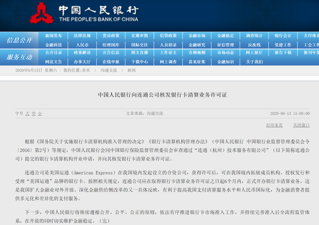 「支付百科」获得消息,今日央行官网挂出最新公告称,央行已向美国运通在华合资公司连通颁发银行卡清算业务许可证,美国运通早于Visa、万事达卡一步,率先获得银行卡清算牌照。