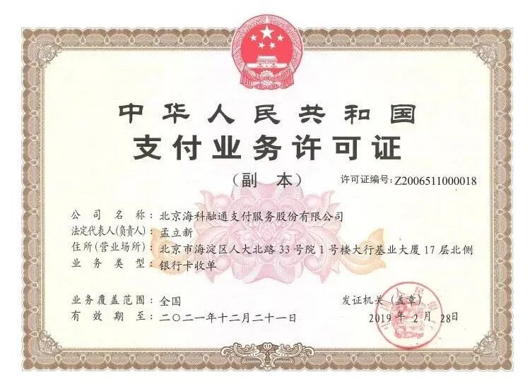 海科融通成立于2001年,于2011年获得中国人民银行颁发的《支付业务许可证》。作为一家由海淀区国资委控股的支付机构,海科融通自诞生以来就具备国有企业独有的优良基因,并始终将安全、稳健、合规作为企业理念持续贯彻。经过十九年的积淀,也让这个支付业内老牌选手对其所在的行业拥有足够成熟的认知,对合规经营、规范发展形成了一套成熟的体系。