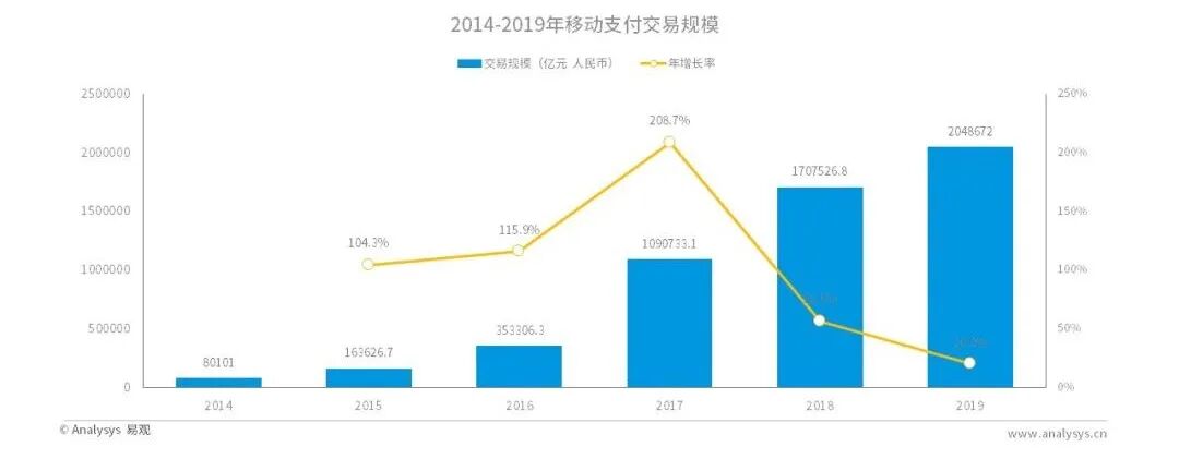 易观《2020中国第三方支付市场数字化发展专题分析》报告显示,2019年移动支付交易规模约达205万亿,相较2018年继续保持增长态势,但交易规模增速已从2017年的208.7%连续两年下降,目前在50%以下区间增长。