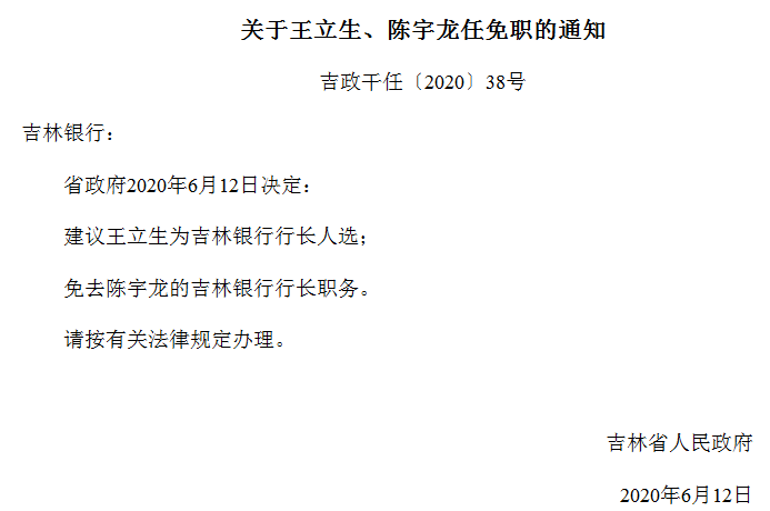 6月12日,吉林省政府决定:建议王立生为吉林银行行长人选;免去陈宇龙的吉林银行行长职务。