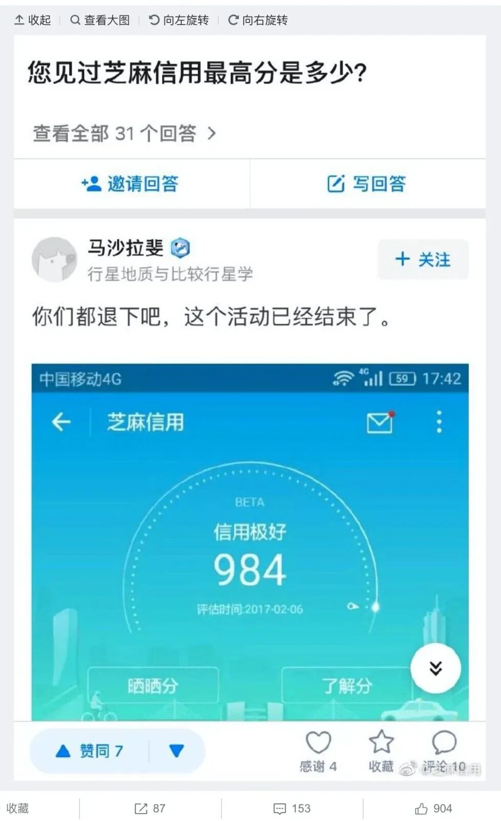 此前,在知乎论坛出现一则“您见过芝麻信用最高分是多少”的问答,一名知乎网友发图表示自己的芝麻分为984,为历史最高。不过随即遭到了芝麻信用卡官方打脸。