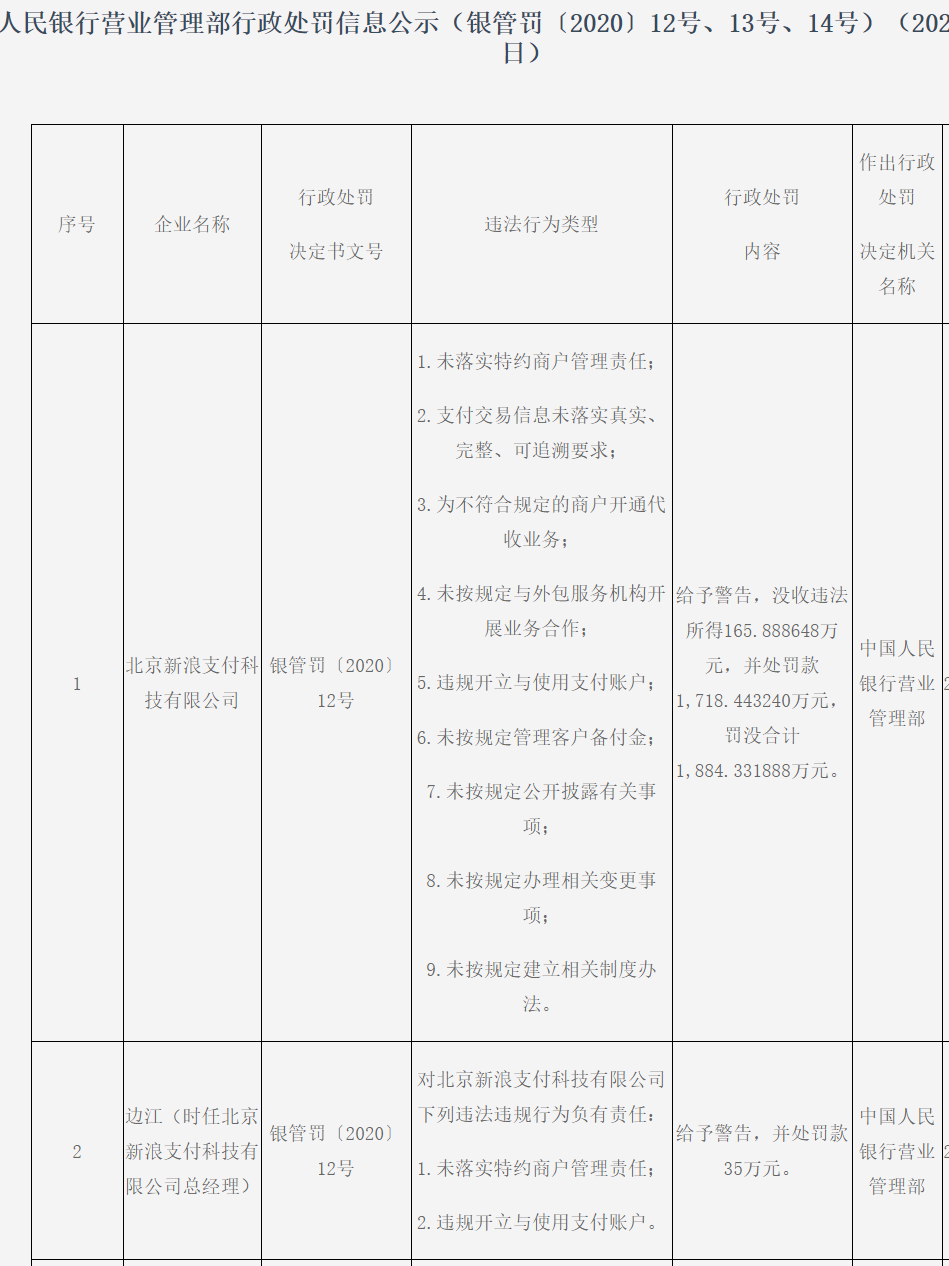 近期,北京新浪支付科技有限公司因涉及多项支付违法行为,被央行没收违法所得166万元,并处罚款1718万元,罚没合计高达1,884万元。与此同时,新浪支付时任总经理边江也被处以35万元罚款。