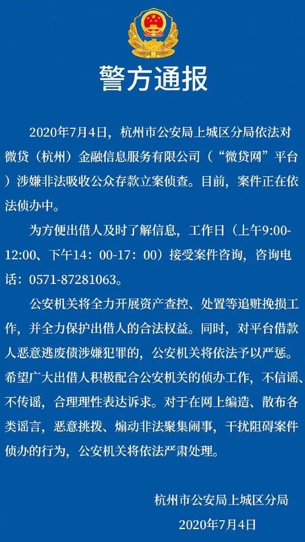 随后,警方微博发文,杭州市上城区防范金融暨网络借贷风险处置领导小组办公室将配合公安机关开展追赃挽损工作,敦促通过微贷网进行借款且尚未还款的借款人积极主动归还借款。