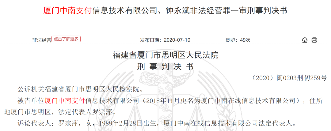 法院经过审理后认为,中南支付非法经营数额较大,情节严重,判处罚金人民币八万元,中南支付实际控制人钟某斌被判有期徒刑三年。