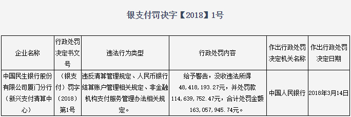 由于涉及违规清算,民生银行在2018年被央行重罚,央行于2017年7月至9月对中国民生银行厦门分行开展了支付清算业务执法检查,民生银行存在违反清算管理、人民币银行结算账户管理、非金融机构支付服务管理等违法违规行为,没收违法所得48,418,193.27元,并处罚款114,639,752.47元,合计处罚金额163,057,945.74元。