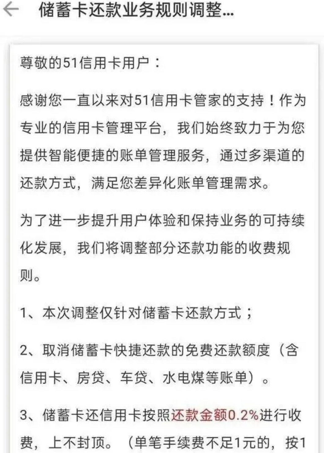 今年6月份,51信用卡宣布调整储蓄卡还款业务规则,取消储蓄卡快捷还款的免费额度,包含信用卡、房贷、车贷等。调整过后,用户通过储蓄卡还信用卡按照还款金额0.2%进行收费且费用上不封顶。