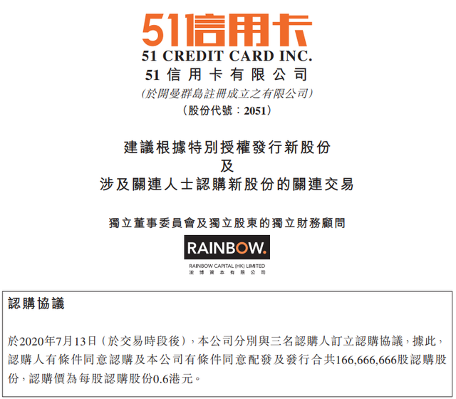 根据51信用卡发布的公告来看,51信用卡拟向新湖中宝集团附属公司、天图集团附属公司及East Jump Management Limited分别发行6666.6万股、3333.3万股及6666.6万股,每股价格为0.6港元,这一价格较7月13日订立认购协议时的收盘价0.79港元/股折让约24.05%。