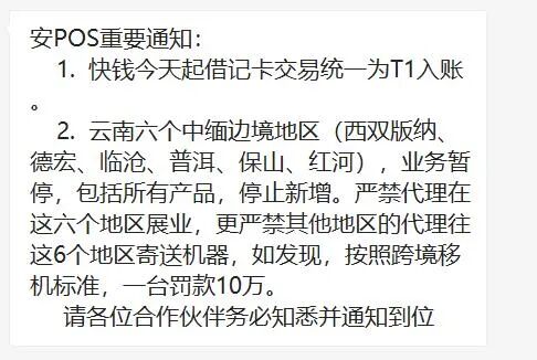 另外还有支付机构表示此6个地区暂停业务,严禁电销、邮寄POS终端,停止新增。一旦发现立即一台处罚10万元。