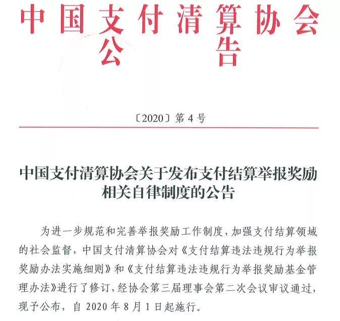 为进一步规范和完善举报奖励工作制度,加强支付结算领域的社会监督,中国支付清算协会对《支付结算违法违规行为举报奖励办法实施细则》和《支付结算违法违规行为举报奖励基金管理办法》进行了修订,经协会第三届理事会第二次会议审议通过,现予公布,自2020年8月1日起施行。