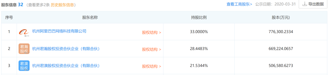 企查查信息显示,目前蚂蚁金服二股东为杭州君瀚股权投资合伙企业,持股比例为28.4483%;三股东为杭州君澳股权投资合伙企业,持股比例为21.5344%。