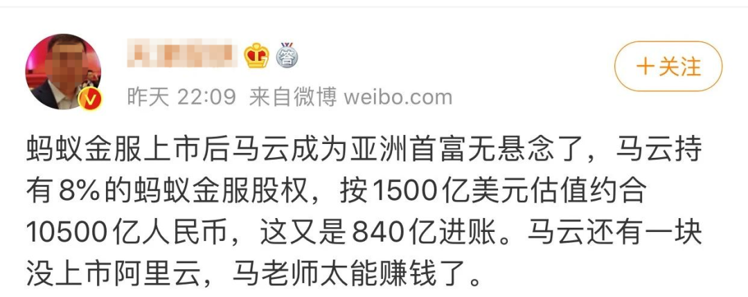 阿里财报显示,马云个人共持有蚂蚁金服8.8%的股权,剩下的股权马云给予了阿里和蚂蚁金服的员工。根据此前媒体报道,蚂蚁金服此次上市的目标估值为2000亿美元,折合人民币约为 1.16万亿人民币,蚂蚁金服一旦最终上市,将给马云带来约1200亿人民币的财富。