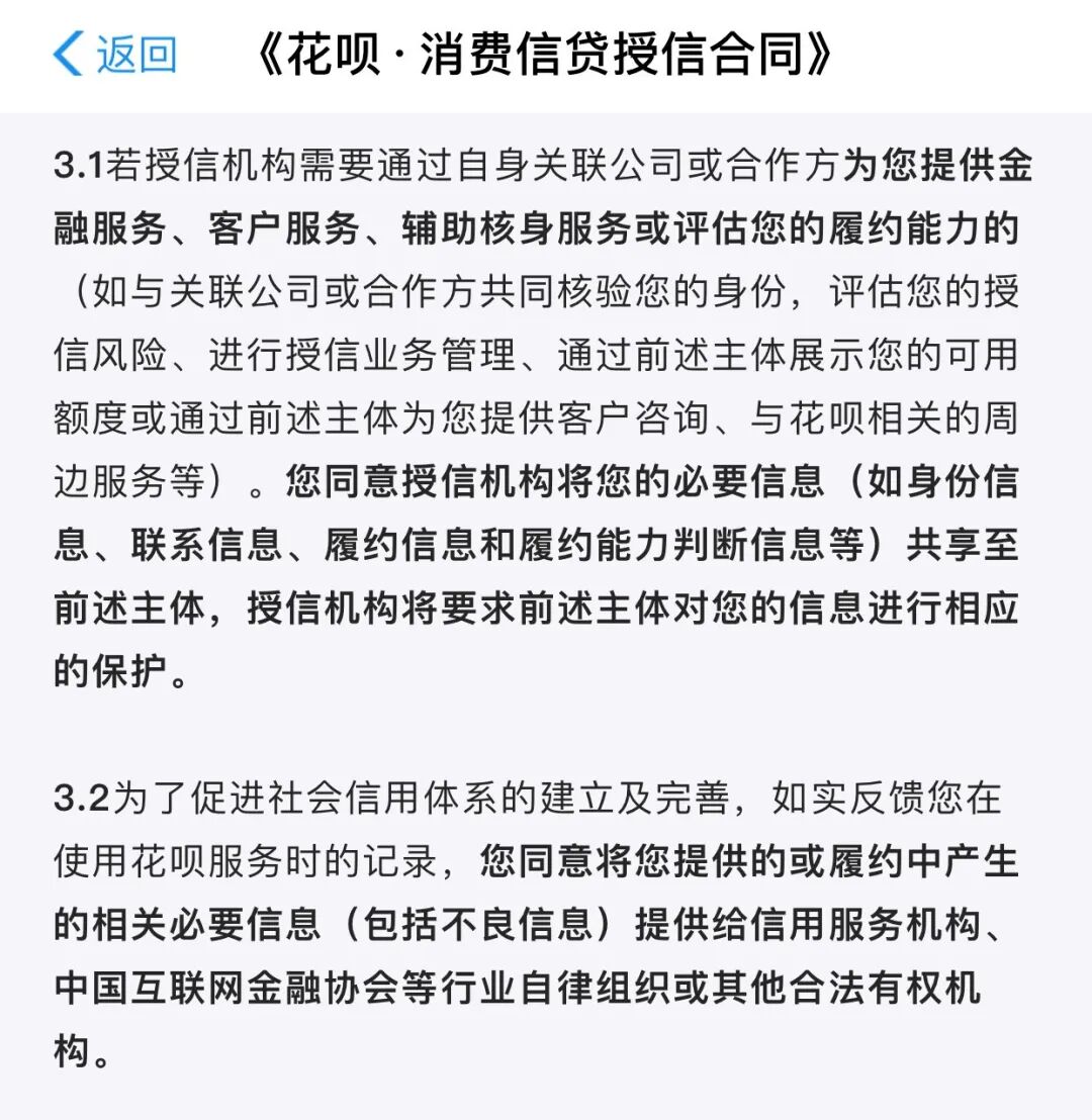 此外,在《花呗消费信贷合同》中也明确提到,为促进社会信用体系的建立及完善,用户在使用花呗服务时产生的不良信息等提供给信用服务机构及中国互联网金融协会等机构。