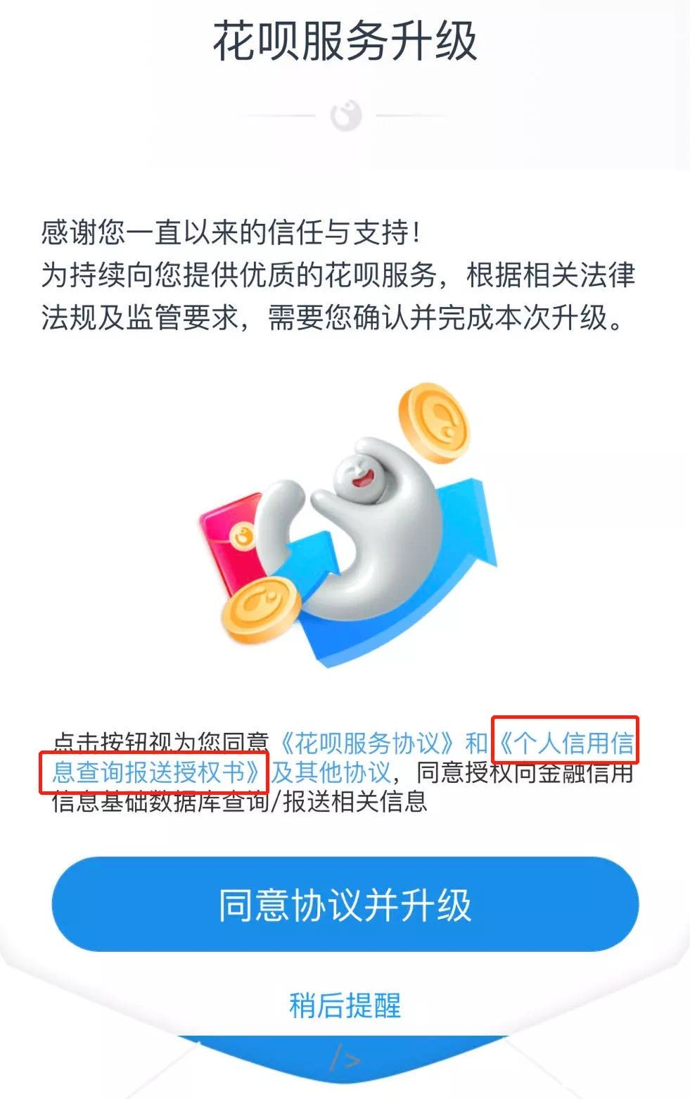 目前,用户可登录支付宝后找到花呗服务,点击“我的”并找到相关合同及产品说明,查看当前是否已升级花呗服务。支付宝方面表示,如果用户选择暂不升级,暂时不影响花呗的正常使用。而同意升级的用户,花呗数据已经开始上报征信。