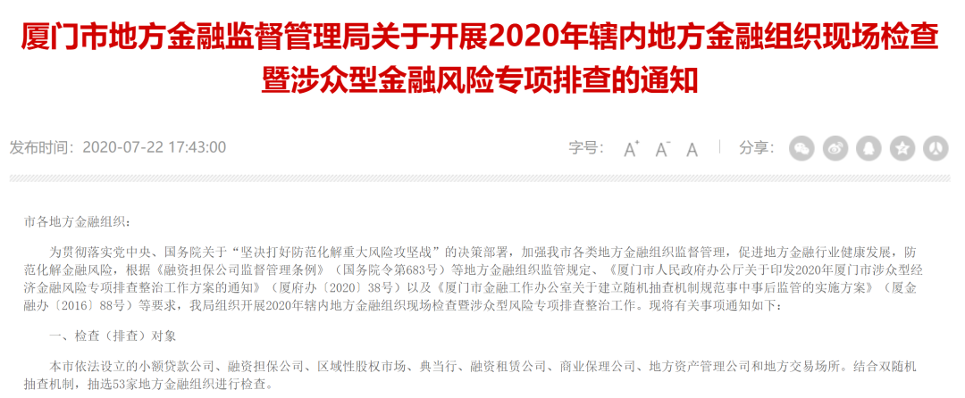 近日,厦门市地方金融监督管理局发布“关于开展2020年辖内地方金融组织现场检查暨涉众型金融风险专项排查的通知”,将对金融机构暴力催收、非法吸收存款、超范围经营等行为进行重点检查。