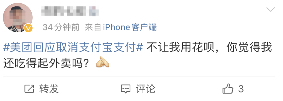 王兴回应后,有网友却表示:“已经习惯了支付宝花呗支付,取消支付宝支付后,连点外卖的钱都没有了。”也有网友表示:“一直在用美团月付点外卖,功能上类似,取消带来的影响不大。”