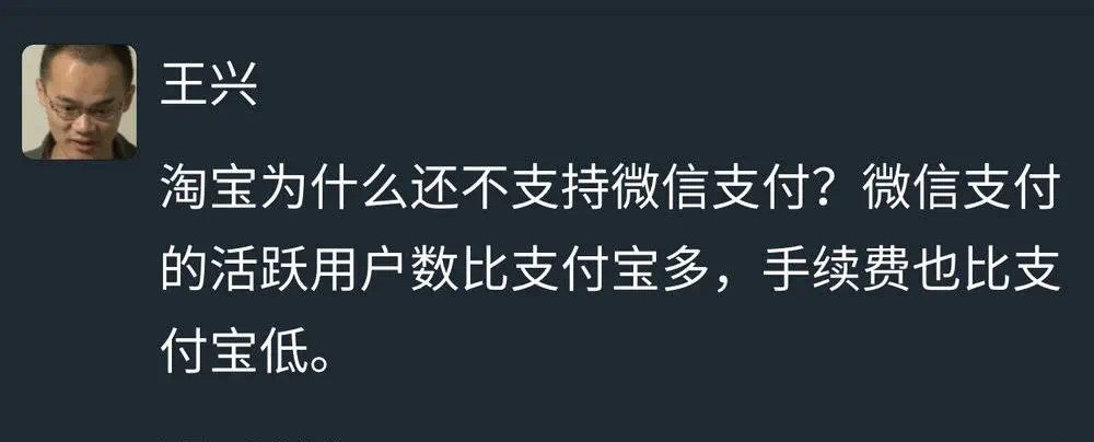 对于此次取消支付宝支付,王兴回应到:微信支付活跃用户数比支付宝多,手续费比支付宝低,淘宝也还是不支持微信支付。