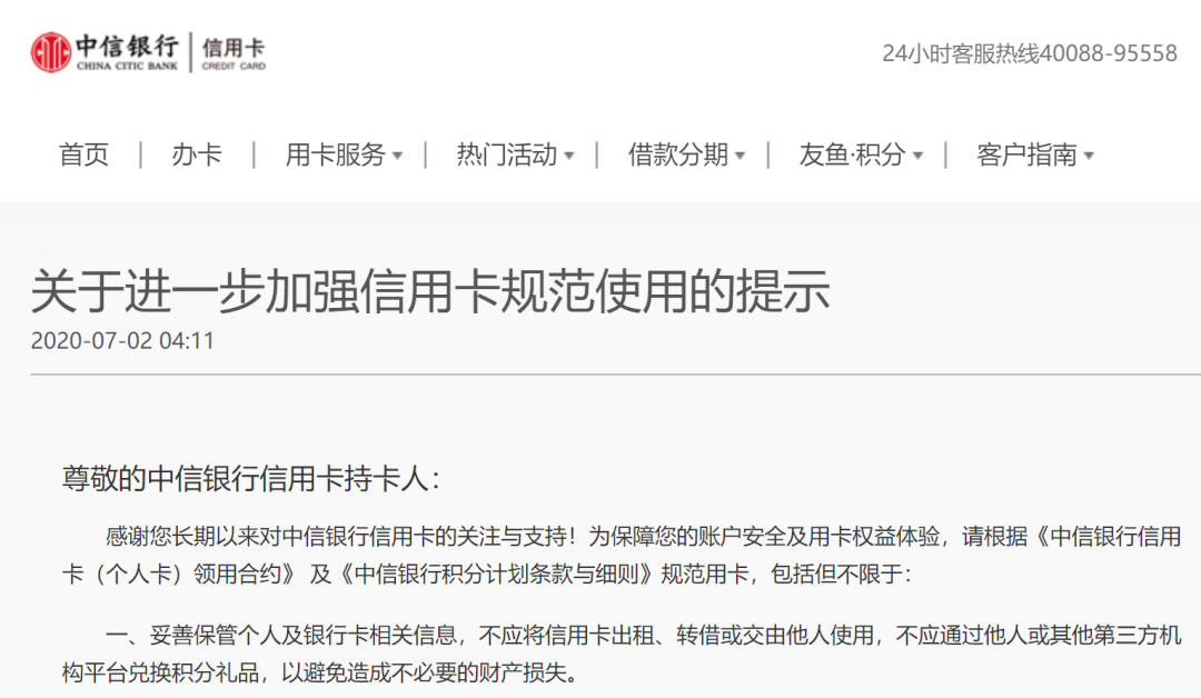 此前在7月2日,中信银行发布关于进一步加强信用卡规范使用的提示公告,公告称为保障您的账户安全及用卡权益体验,请根据《中信银行信用卡(个人卡)领用合约》 及《中信银行积分计划条款与细则》规范用卡,包括但不限于: