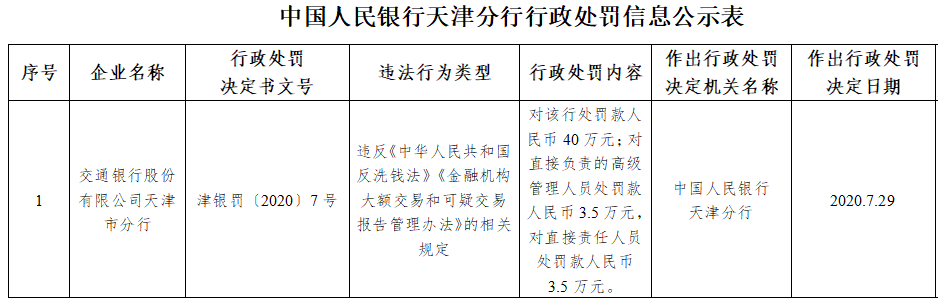 交通银行天津分行因违反《中华人民共和国反洗钱法》《金融机构大额交易和可疑交易报告管理办法》的相关规定。央行对该行处罚款人民币40万元,对直接负责的高级管理人员处罚款人民币3.5万元,对直接责任人员处罚款人民币3.5万元。