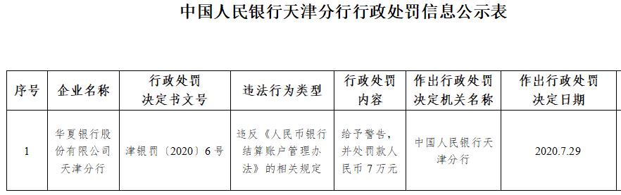 华夏银行天津分行违反《人民币银行结算账户管理办法》的相关规定,央行对该行给予警告,并处罚款人民币7万元。
