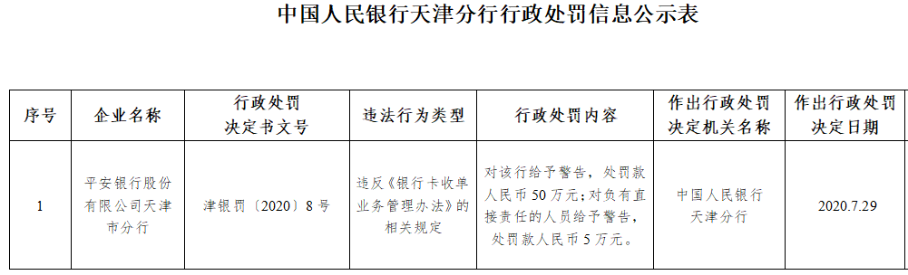 平安银行天津分行因违反《银行卡收单业务管理办法》的相关规定;央行对该行给予警告,并处罚人民币50万元,对负有直接责任的人员给予警告,处罚人民币5万元。