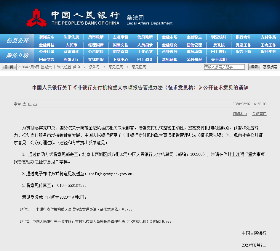 8月7日晚间中国人民银行发布《非银行支付机构重大事项报告管理办法(征求意见稿)》,意见稿要求支付机构报告重大事项应当一事一报,做到及时、真实、准确、完整,不得迟报、漏报、瞒报、谎报、错报,不得有误导性陈述或者重大遗漏。