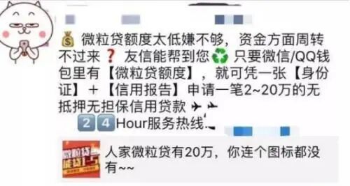 这些人员声称可以帮助用户获得开通微粒贷的资格,而且可以保证额度。在宣传时还会提供成功开通微粒贷的案例,有了材料的证明,加上对朋友圈的包装,显得异常真实。