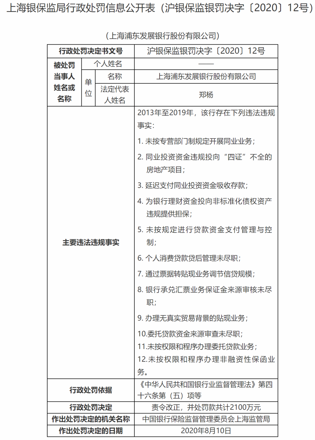 8月11日,上海银保监局公布的行政处罚信息公开表显示,上海浦东发展银行股份有限公司因涉及未按专营部门制规定开展同业业务等十二项违法违规行为,被责令改正并罚款2100万元。