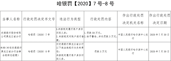近期中国人民银行哈尔滨中心支行发布新罚单,交通银行股份有限公司黑龙江省分行因未按规定履行客户身份识别义务被罚款50万元;未按规定对账户进行备案给予警告,并处罚款3万元。