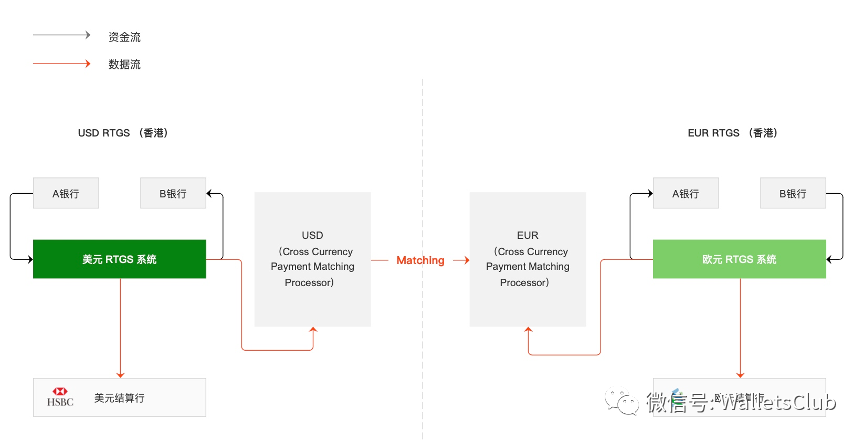 所以,香港作为外汇往来极其频繁的国际金融中心,一定要控制好这类风险才能营造出好的金融营商环境,让银行们放心的玩耍。如何控制这一风险呢?首先要消除时差的障碍,怎么消除?要么就在我本地交易(没时差),要么交易的时候大家都得是开市状态,还得做到同时交收。PvP 机制是怎么做到同时交收的呢?核心就是要做到两个结算系统间的同步,香港用了一种叫做 Cross currency payment matching processor 的机制,简单的原理如下图所示(以 USD & EUR 货币对外汇交易为例):