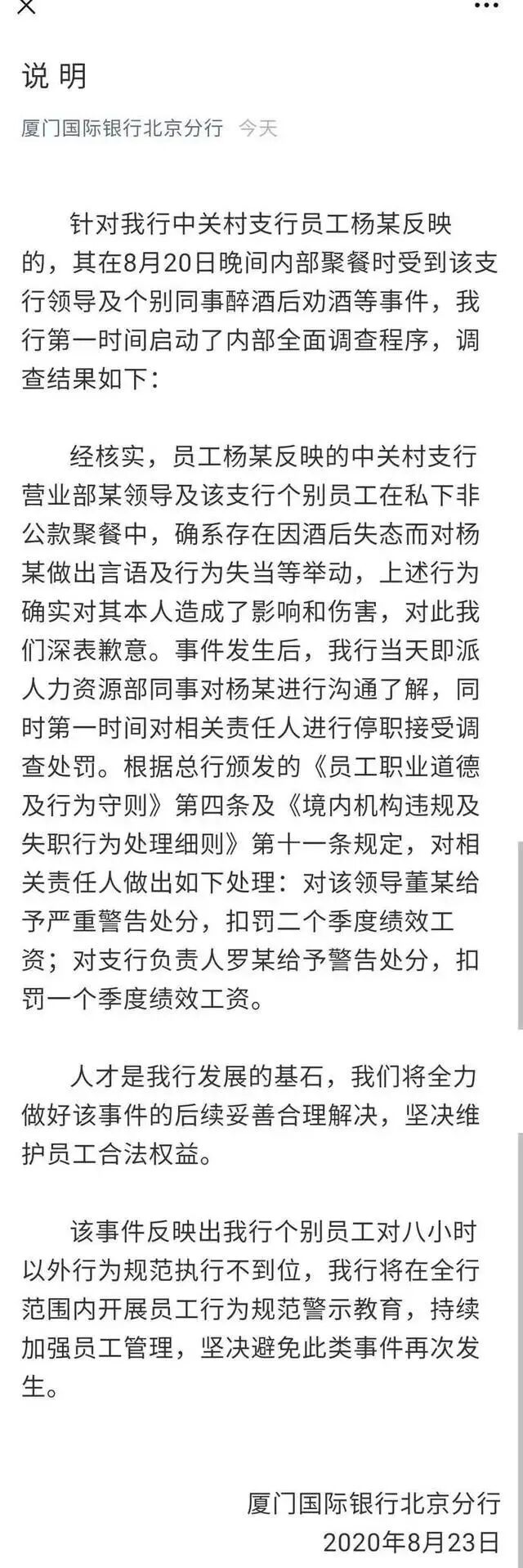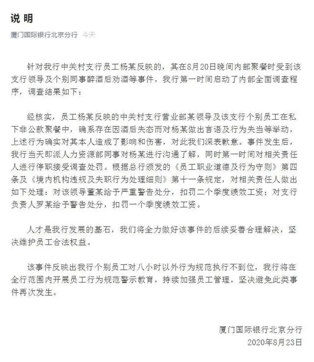 声明中表示,经核实,员工杨某反映的中关村支行营业部某领导及该支行个别员工在私下非公款聚餐中,确系存在因酒后失态而对杨某做出言语及行为失当等举动,上述行为确实对其本人造成了影响和伤害,对此我们深表歉意。