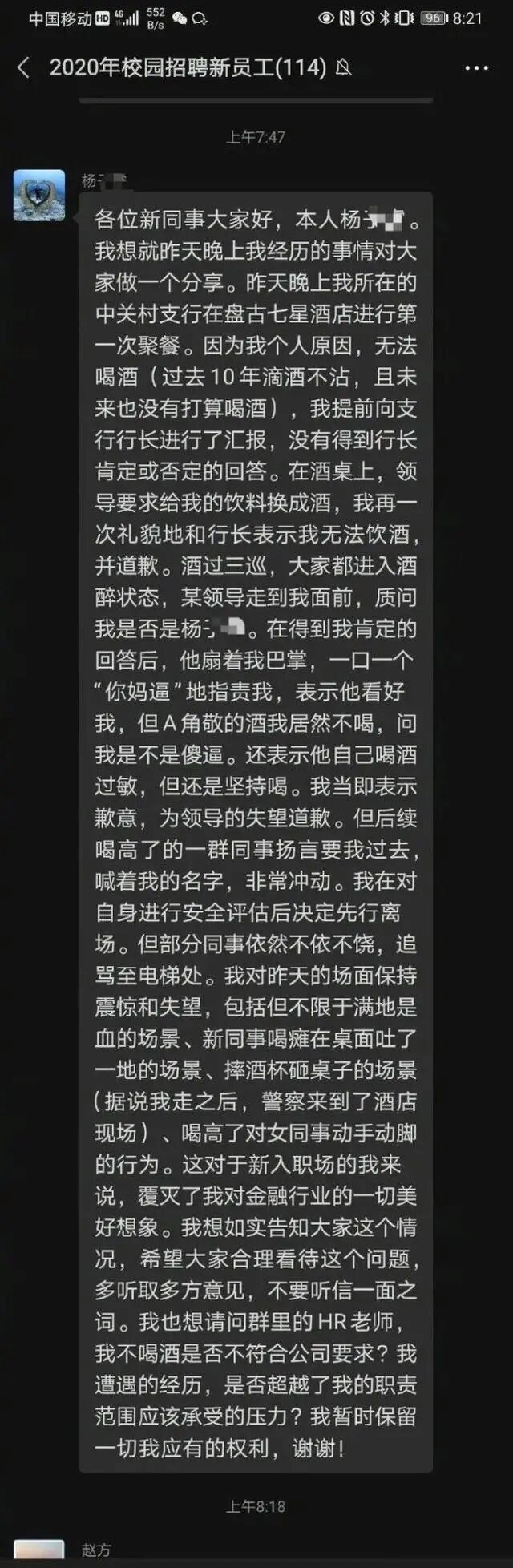 这位新员工称:“在酒桌上,领导要求饮料换成酒,其再一次礼貌地和行长表示我无法饮酒,并道歉。酒过三巡,大家都进入酒醉状态,某领导走到面前,质问他是否是杨XX。在得到肯定的回答后,他扇着我巴掌,一口一个”XXX”地指责我,表示他看好我,但A角敬的酒我居然不喝,问我是不是傻。”