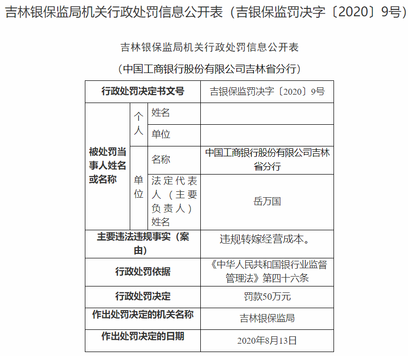 《吉银保监罚决字〔2020〕9、10号》显示,工行吉林省分行因“违规转嫁经营成本”,被吉林银保监局依据《中华人民共和国银行业监督管理法》第四十六条,处以罚款50万元。
