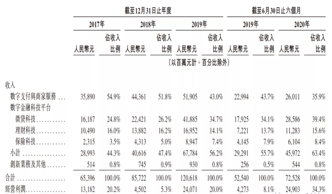 值得一提的是,蚂蚁集团的微贷科技业务吸金能力最强。蚂蚁集团的微贷业务包括蚂蚁花呗、蚂蚁借呗、网商贷,2019年微贷业务贡献了蚂蚁全部营收的34.7%;2020年上半年,微贷业务营收更是占蚂蚁集团总营收的39.43%。