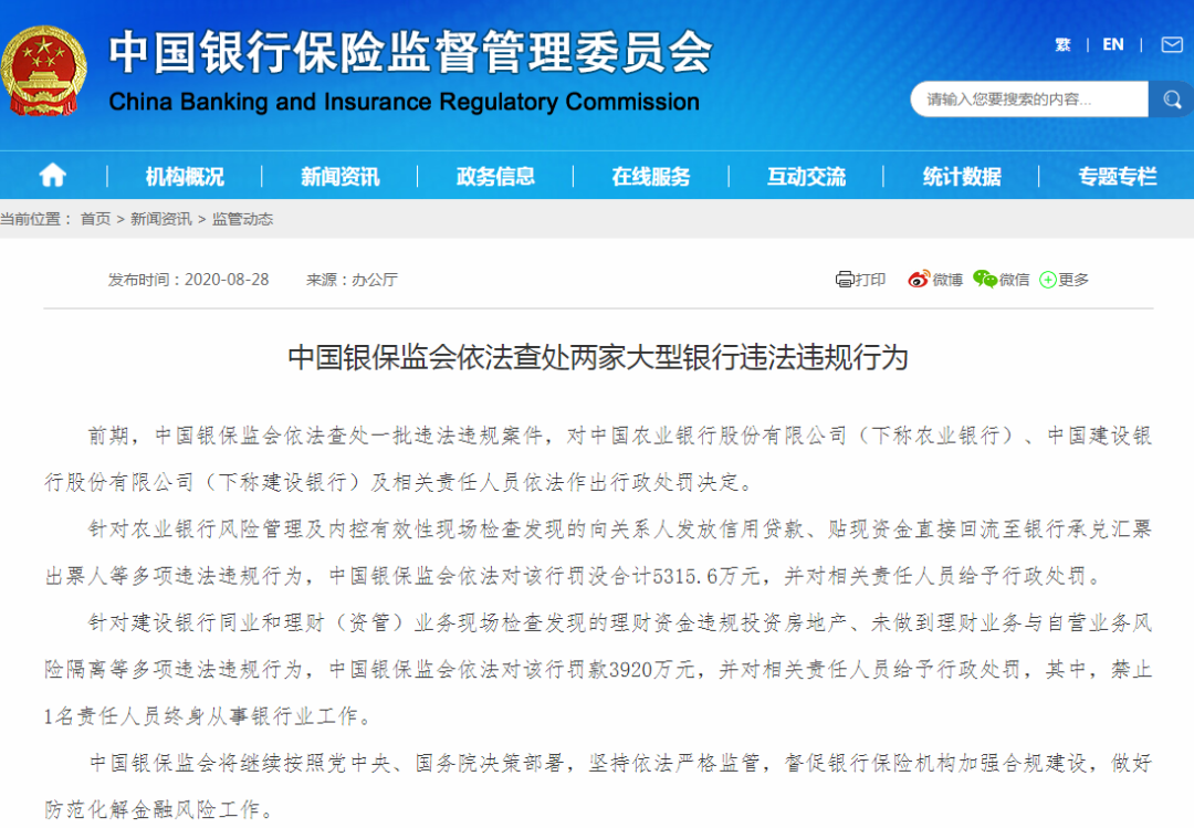 中国银保监会昨天披露,前期,银保监会依法查处一批违法违规案件,对中国农业银行、中国建设银行及相关责任人员依法作出行政处罚决定。