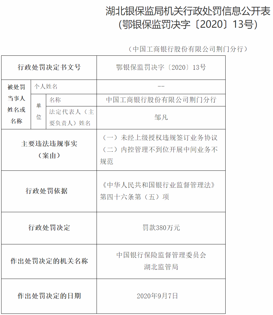 中国工商银行荆门分行行长肖勇对中国工商银行股份有限公司荆门分行未经上级授权违规签订业务协议、内控管理不到位开展中间业务不规范的违规行为负有领导责任,其被禁止从事银行业工作10年。