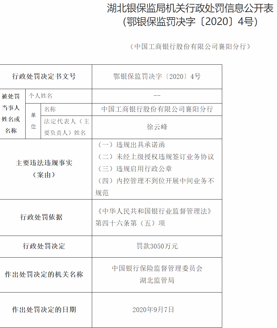 具体来看,中国工商银行襄阳分行被罚款3050万元,其主要违法违规事实为: