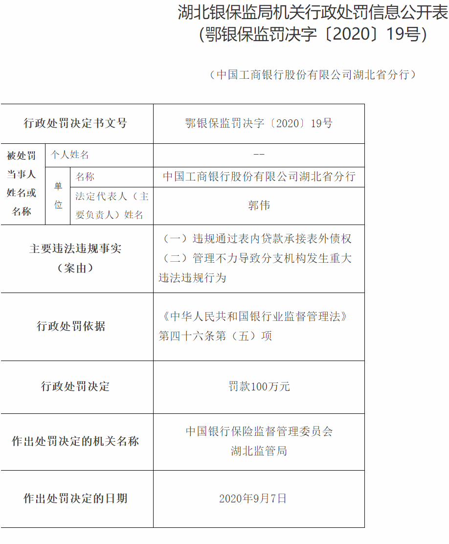 湖北省分行副行长张金星,对中国工商银行股份有限公司湖北省分行管理不力导致分支机构发生重大违法违规行为负有领导责任,被罚款5万元。