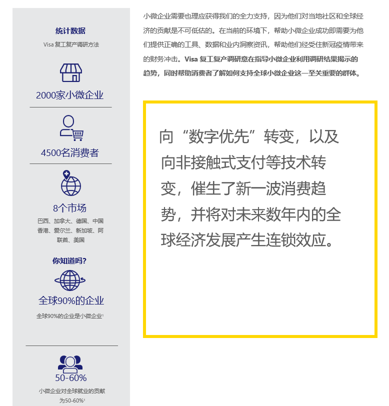 Visa的一项调查显示,有43%的小微企业表示他们的资金只够维持六个月的经营[1]。面对新环境带来的巨大的挑战,Visa基金会启动了一项为期五年的计划,承诺投入2亿美元扶持全球的小微企业。除了基金会的工作之外,Visa还承诺帮助5000万小企业实现数字化转型,助力全球各地社区从疫情中恢复。我们希望能够通过与各地政府、行业和社区的合作,帮助小微企业快速重建或新建强大的数字化商业模式,使他们不仅能够从新冠疫情的打击中免遭重创,还能借助数字化转型在未来获得可持续发展。