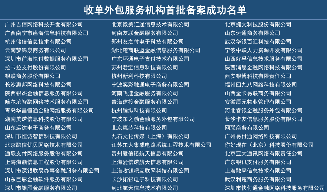 9月16日,中国支付清算协会举办了收单外包服务机构备案系统上线启动会,正式启动收单外包服务机构备案系统,同时发布银商、拉卡拉、通联、收钱吧、利楚等首批60家备案成功机构名单。
