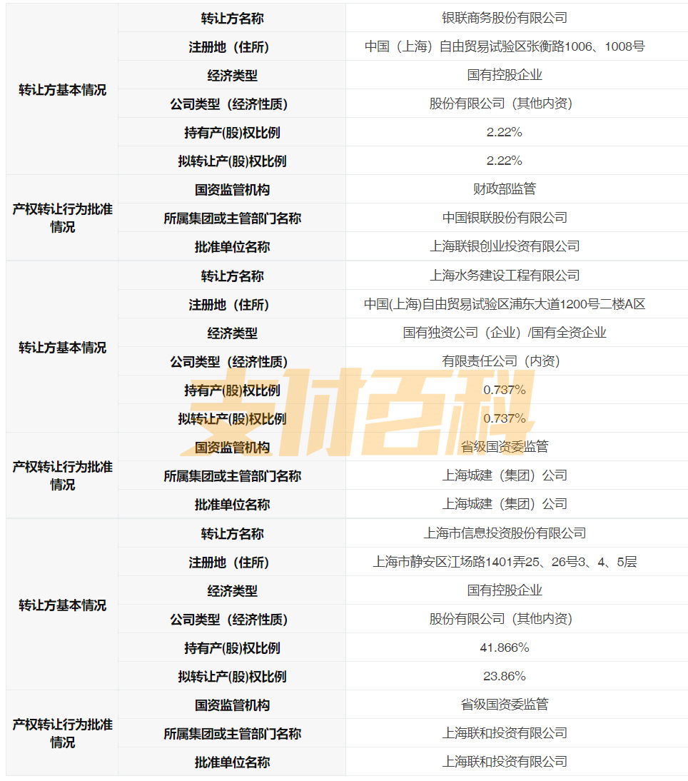 其中,银联商务股份有限公司转让其拥有的上海付费通2.22%的股权,上海水务建设工程有限公司转让其拥有的上海付费通0.737%的股权,上海市信息投资股份有限公司转让其拥有的上海付费通23.86%的股权。