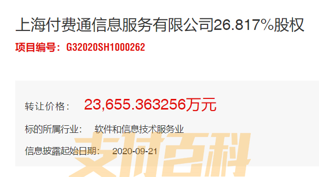 今日,「支付百科」获得独家消息,上海付费通信息服务有限公司进行股权转让,以23655.363256万元(2.36亿元)的挂牌价格出售26.817%的股权。