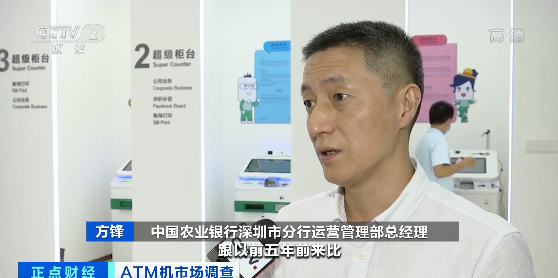 中国农业银行深圳市分行运营管理部总经理 方锋:现在的网点业务量比五年前翻了超一倍,但单纯从现金、ATM的角度来看,下降的量是较大的,我们现在ATM的现金量一台约一百笔。