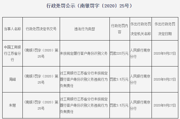 周峰对工商银行江苏省分行未按规定履行客户身份识别义务违规行为负有责任罚款3.5万元;