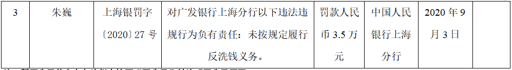 另外李英斌、朱巍对广发银行上海分行未按规定履行反洗钱义务负有责任,分别被罚3.5万元。